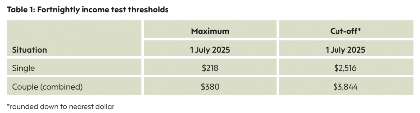 From 1 July 2025, the income test thresholds will increase slightly as illustrated in the table below.
