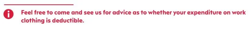 On the other hand, occupation-specific clothing falls on the deductible side of the line, for example a chef’s distinctive chequered pants or a health worker’s blue uniform, including nurses’ stockings and non-slip shoes.