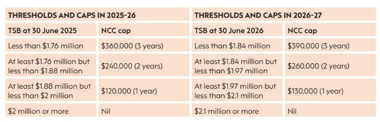 The table below highlights how the TSB thresholds and NCC caps will change from 2025–26 to 2026–27.